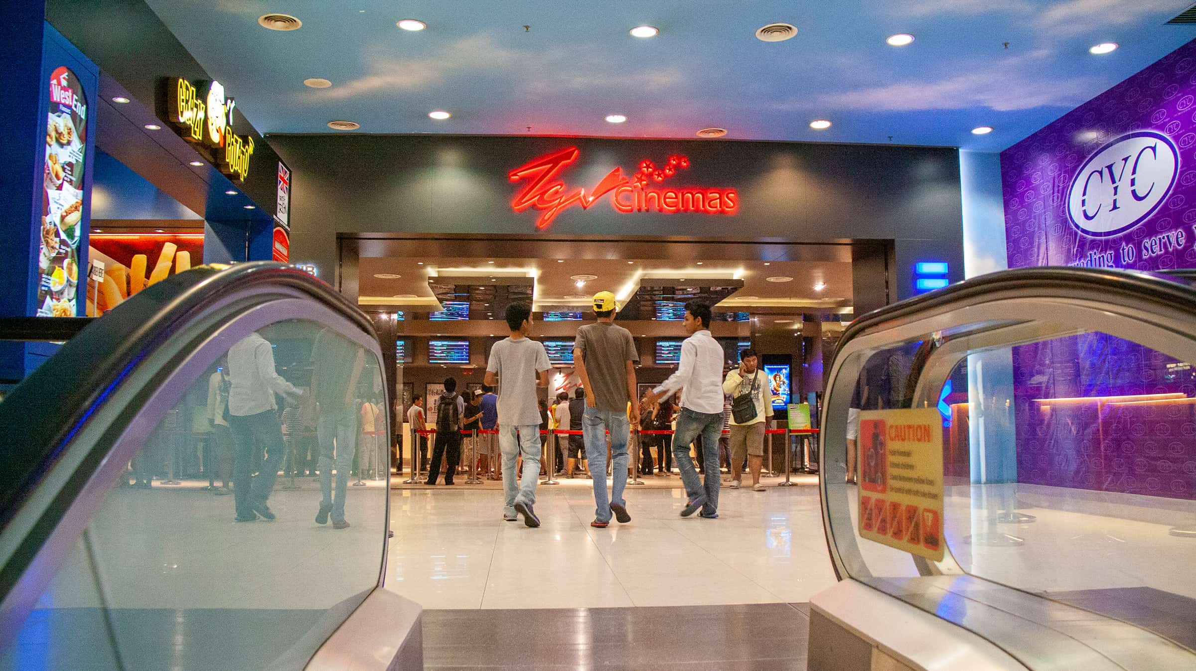 Kijk niet vreemd op als mensen hun eigen etenswaren mee brengen. Dit is prima mogelijk en niemand zal er raar van opkijken. Vooral locals nemen vaak aanzienlijk goedkoper eten van buiten mee (vooral snoepgoed). De bioscoop vind je bijna altijd op de hogere verdiepingen van de winkelcentra, dezelfde verdieping waar je vaak foodcourts en fastfood outlets hebt.