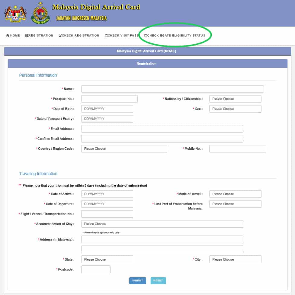 Nadat je dit hebt ingevuld krijg je een bevestiging via het e-mailadres dat je hebt ingevoerd. Je kunt de status ook via de MDAC-website opvragen, maar veel mensen klikken dan op de tab: “Check Visit Pass” en dit is niet de juiste tab. Om een succesvolle MDAC-aanvraag te controleren kies je de tab: “Check E-Gate Eligibility Status”.